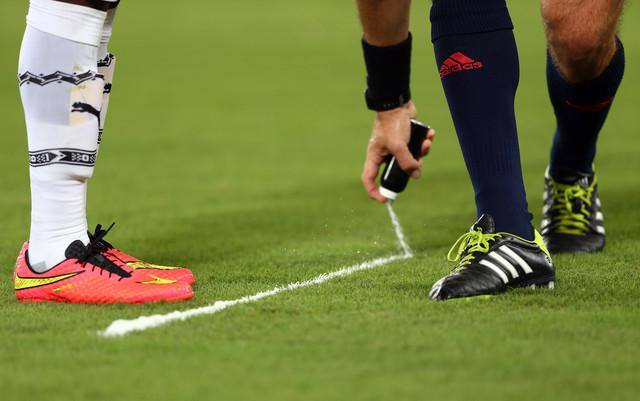 Ans. This is a vanishing spray used by the referees to mark the distance of 10 yards, which is 9.15 metres..