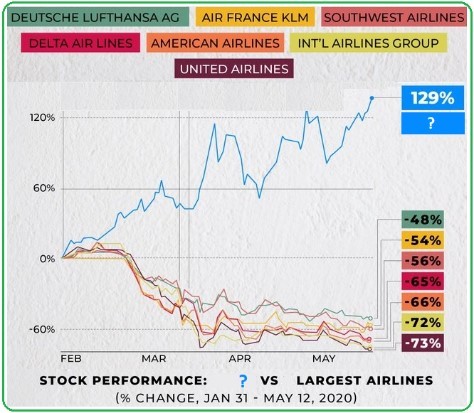 5. In May’20, within a single year, market value of this company jumped from ₹4,675 Cr to ₹3,66,890 Cr. This company became more valuable than the combined largest airlines (see the names in the graph) of the world during the last four months. The wife of the founder inspired him to tinker about this company. Name the company
