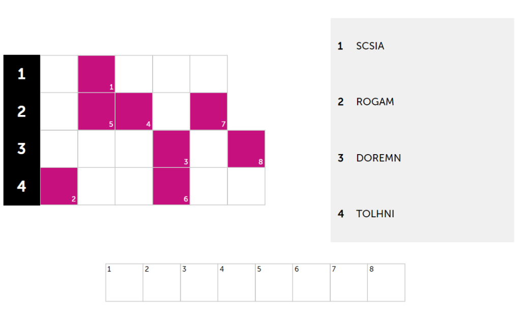 Unscramble 4 famous brands with jumbled letters! Example: PALEP = APPLE. Correct answers turn green. Use letters from each brand to solve the hidden puzzle (clue provided). The number indicates the letter’s position in the solution. Crack the hidden solution to help unscramble tricky brands!