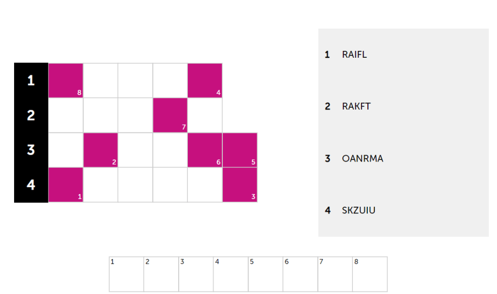 Unscramble 4 famous brands with jumbled letters! Example: PALEP = APPLE. Correct answers turn green. Use letters from each brand to solve the hidden puzzle (clue provided). The number indicates the letter’s position in the solution. Crack the hidden solution to help unscramble tricky brands!