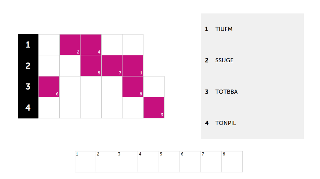 Unscramble 4 famous brands with jumbled letters! Example: PALEP = APPLE. Correct answers turn green. Use letters from each brand to solve the hidden puzzle (clue provided). The number indicates the letter’s position in the solution. Crack the hidden solution to help unscramble tricky brands!