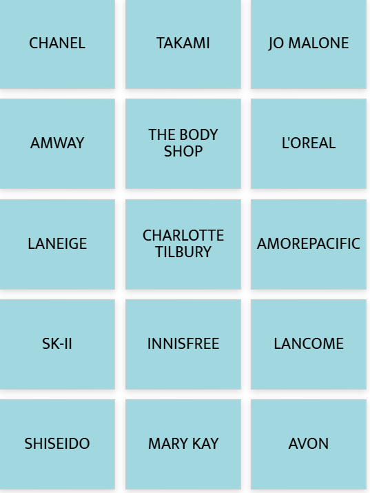 Here there are 15 brand/company logos. There are 3 brands belonging to to each category.Each brand belongs to one category only.